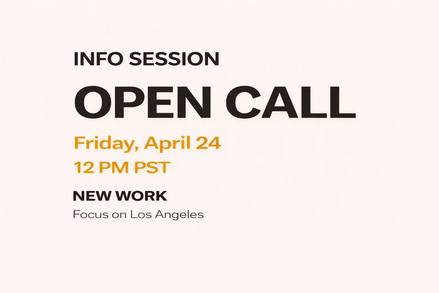 Join us for a virtual information session on Friday, April 24 at 12 PM PST to learn more about our 2027 and 2028 NEW WORK Focus on Los Angeles open call and ask questions about the application process.