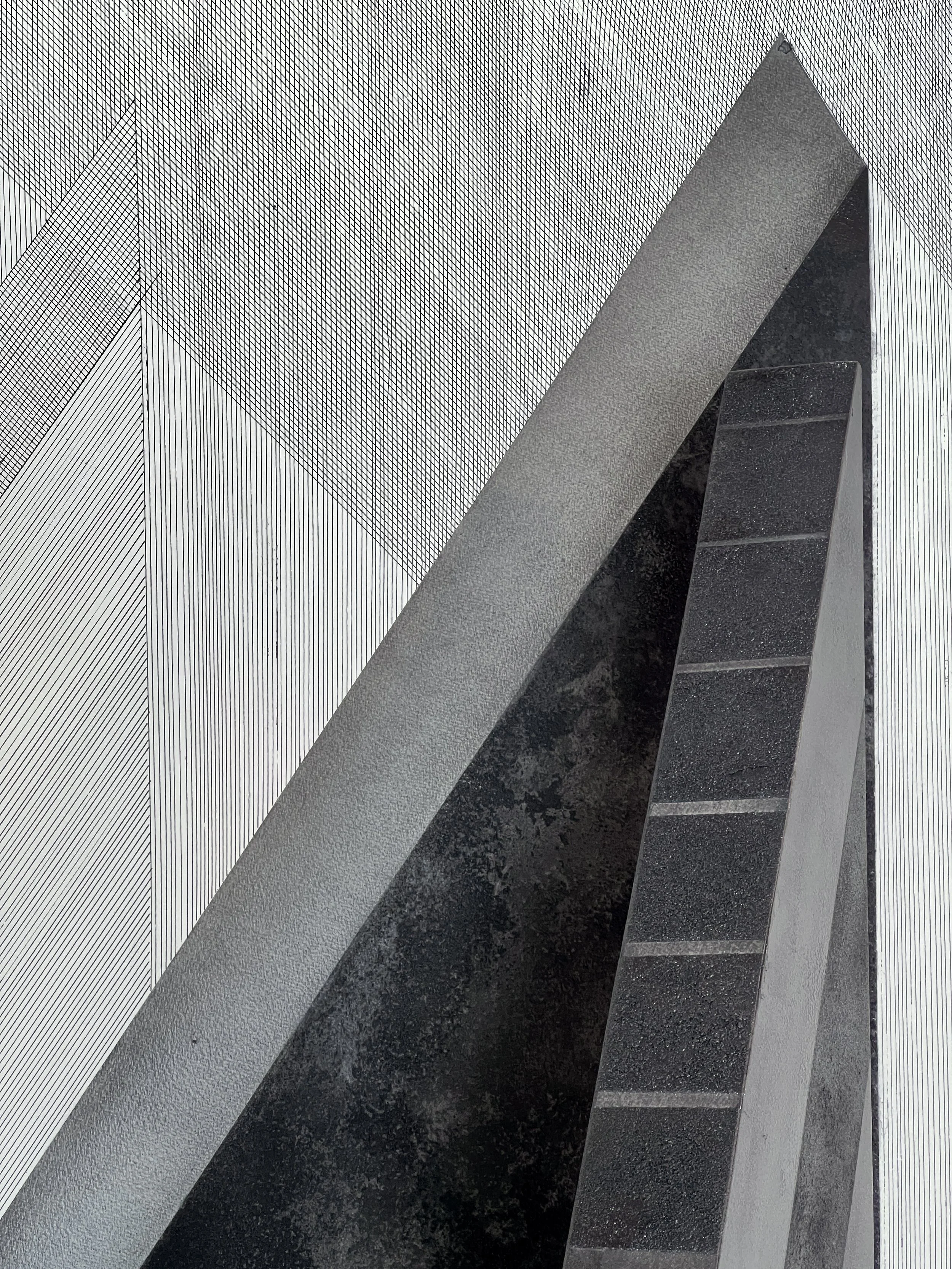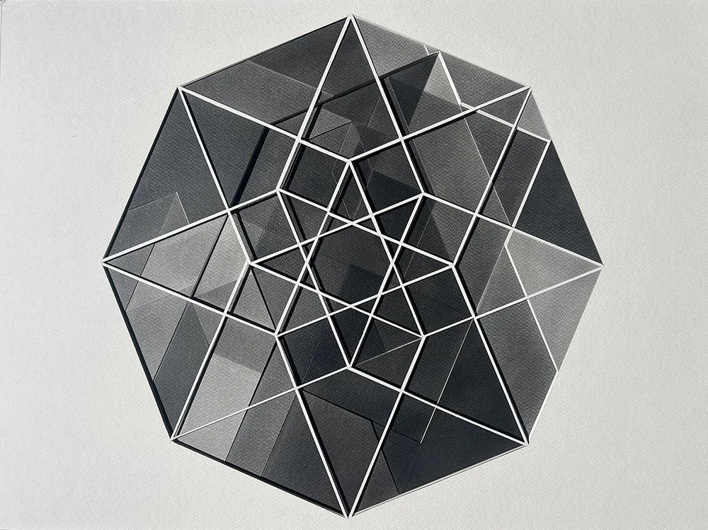 Inspired by Robert A. Heinlein’s science fiction short story And He Built a Crooked House, Philips’ installation reimagines the story’s dimensional experimentation through a spatial arrangement of sculptures and drawings. Loosely modeled on the unfolded form of a tesseract, the works explore ideas of space-time, connectivity, and perception. Installed within Winslow Garage, the project engages in a site-specific dialogue: while Heinlein’s fictional house embodies sleek geometric precision, the garage’s crooked architecture and uneven floor disrupt the clean minimalism of the black-and-white works, creating tension between site and form.